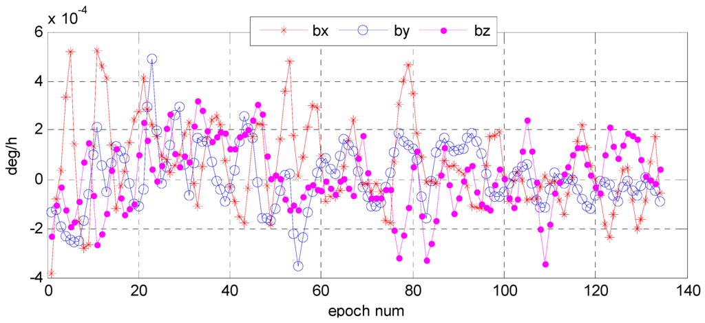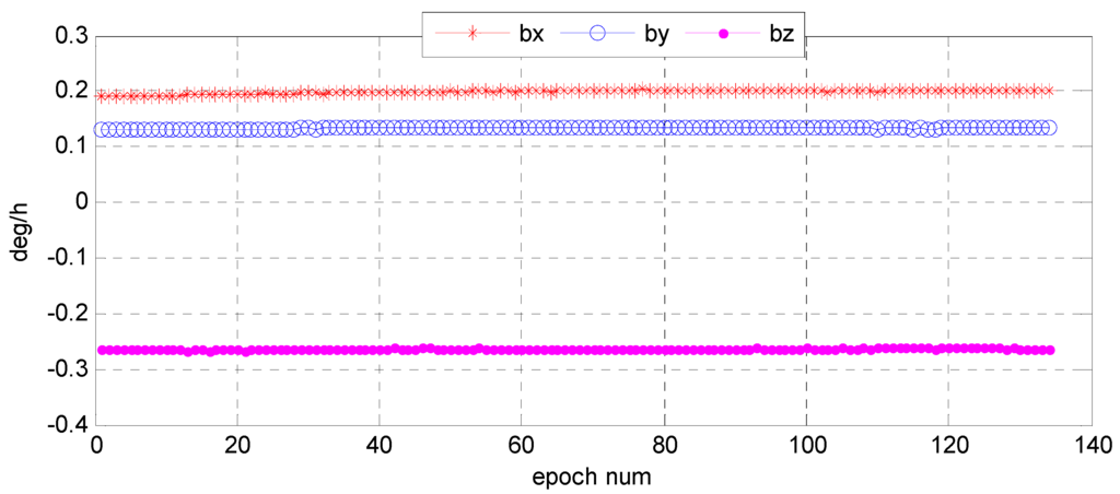 Furthermore, we assume that the two types of noise are independent. represents the gyro bias white noise; and is the mean square error of the gyro bias white noise.