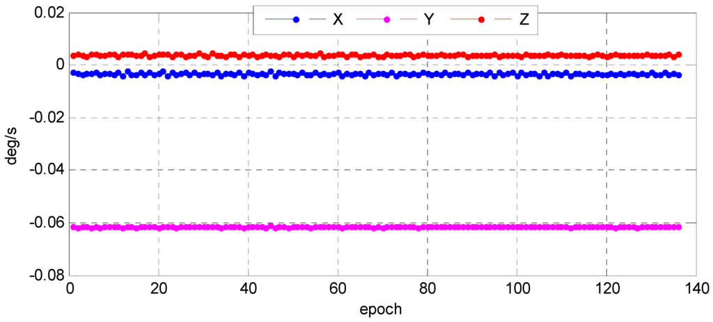 In order to further verify the convergence and stability of the designed filter, we present a detailed description of the change in the gyro angle velocity estimates after star sensor and gyro information fusion. As shown in Figure 18, the values of the gyro angle velocity in three directions became close to the true state of the satellite flight that when the satellite was in stable flight, the angular velocity measured by the gyro was the angular velocity of the satellite around the Earth, about 0.06 degrees per second, and the measurement noise was effectively smoothed out. For more details, we list the average value and mean square of the Euler angle and error bias errors in the photos taken in different calibration fields at different times, and the two errors tended toward a Gaussian distribution (Table 3 and Table 4). Therefore, the bidirectional Kalman filter was reliable, which could maintain the convergence and stability.