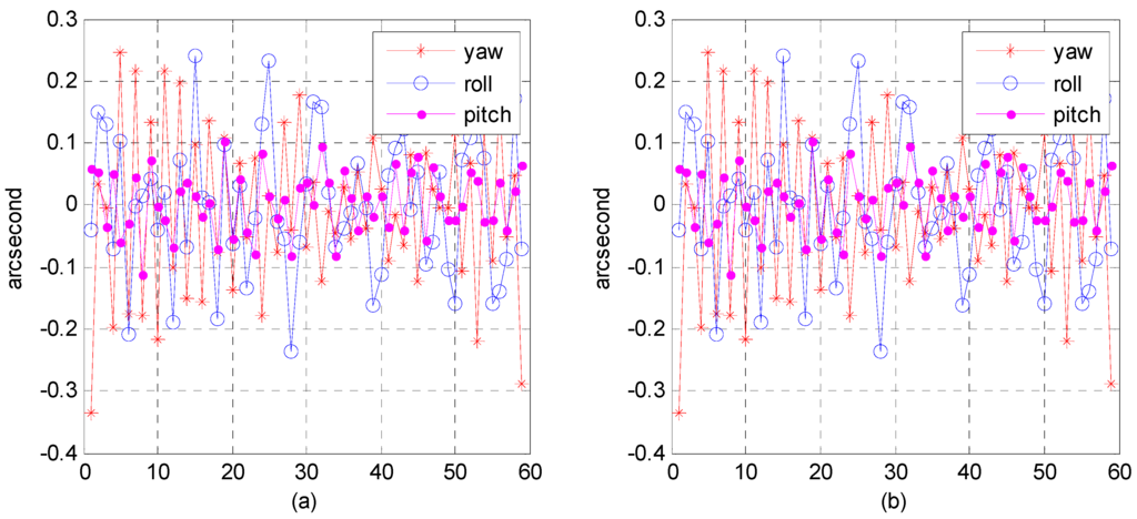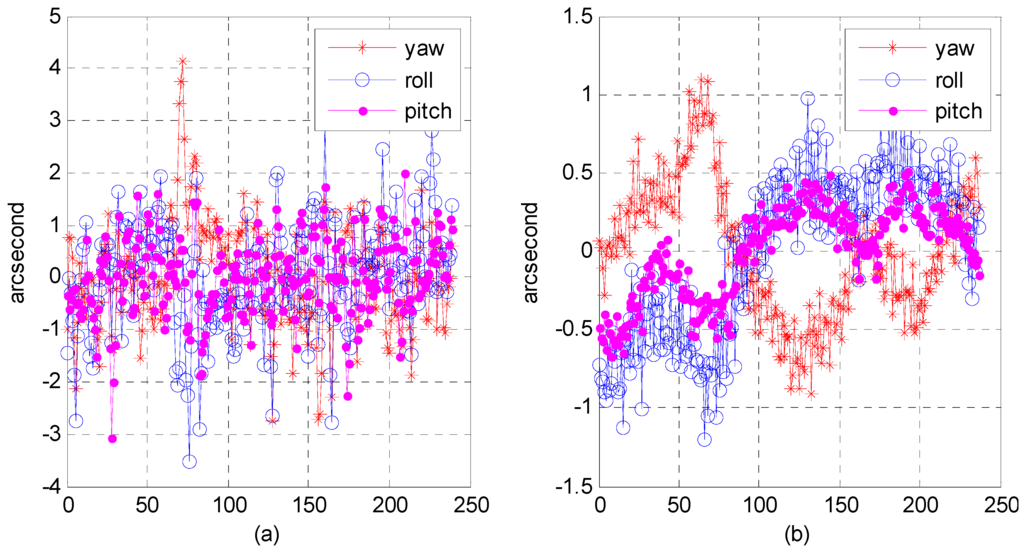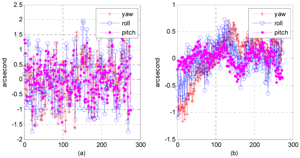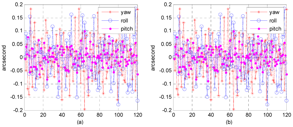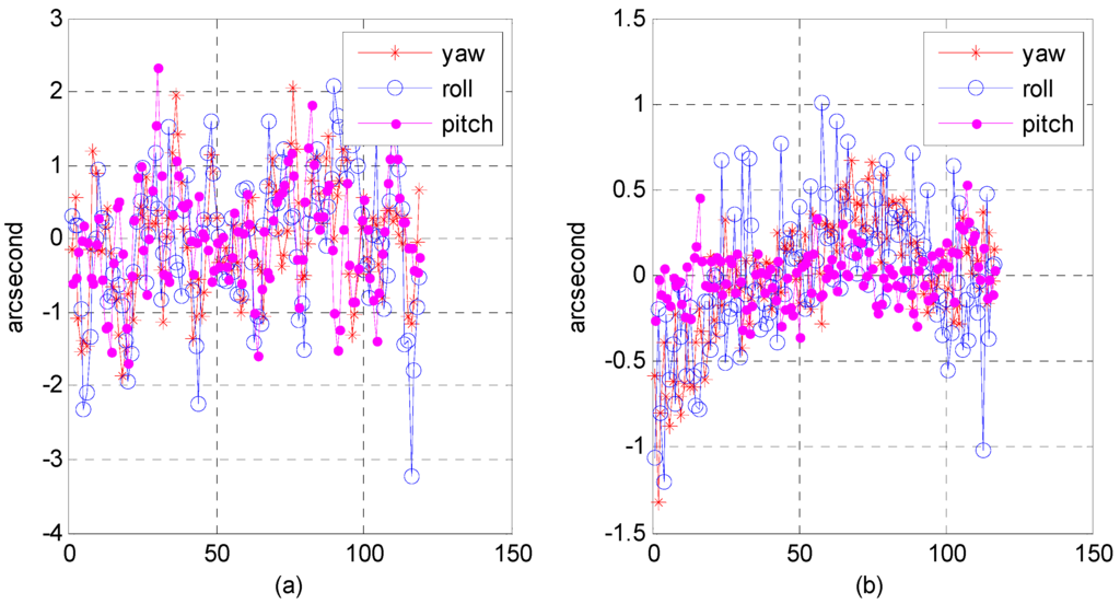 Distribution of relative attitude error using photos taken in the Songshan calibration field: (a) in multi-star sensor combination; (b) in star sensor and gyro combination.
