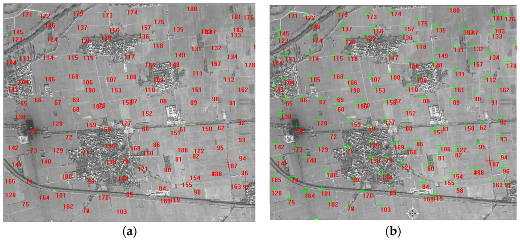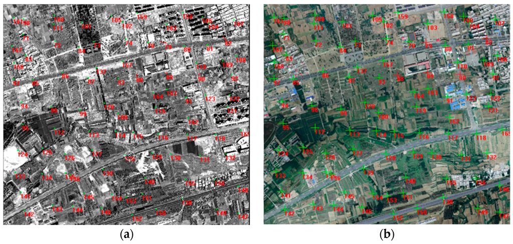 Correspondence points between the DOM image and geometric correction image of the satellite panchromatic camera taken in Songshan on 16 March 2015: (a) panchromatic image; (b) reference image.