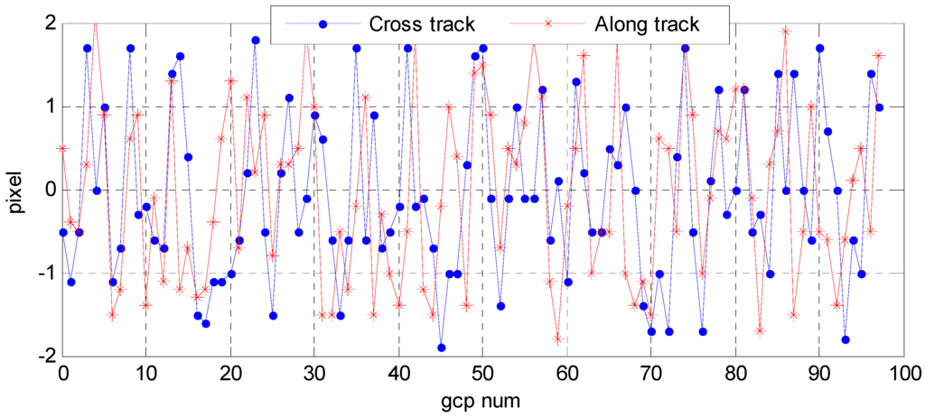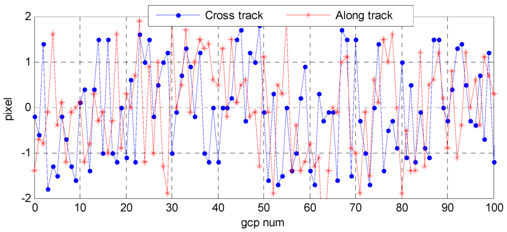 Wuhan University developed an optical satellite ground pretreatment system for the Yaogan-24 remote sensing satellite image processing, and we conducted experiments on the platform. The optical satellite ground pretreatment includes radiation treatment, sensor calibration, geometric correction, and so on. We took attitude data as the input for image preprocessing, and then analyzed the geometric accuracy on the basis of the geometric correction product and DOM/DEM of the calibration field reference data. Figure 25 and Figure 26 show the distribution of correspondence points between the DOM images and geometric correction images taken by the satellite panchromatic camera in Songshan on 16 March 2015 and in Anyang on 9 February 2015. The correspondence points between the DOM and geometric correction images were sufficient and were distributed more evenly to ensure the reliability of the geometric precision. Figure 27 and Figure 28 show the distribution of the relative geometric accuracy in the cross-track and along-track directions of the panchromatic image with respect to the DOM/DEM of the calibration field. The relative geometric accuracies in the cross-track and along-track directions were clearly between 1.5 and 2.0 pixels. Meanwhile, we concluded that the relative accuracy in the attitude data was 0.3–0.5 arcsec with respect to the precise attitude data calculated on the optical image in the geometric calibration field in Section 3.2. Therefore, both conclusions confirmed each other. Table 7 and Table 8 respectively show detailed statistics on the uncontrolled and relative positioning accuracy of the satellite geometric correction image taken by the panchromatic camera based on on-board and on-ground processing attitude data. Furthermore, we could conclude that the side swing angle did not affect the image geometric correction accuracy under no control-point condition when images were taken in different calibration fields, and the uncontrolled and relative positioning accuracy of the geometric correction image based on on-ground processing attitude data was about 15 m and 1.3 pixels, comparing to on-board attitude data about 30 m and 2.4 pixels, which increased about 50%. As the attitude determination accuracy of the star sensor was 5 arcsec, which is configured by the satellite, and the orbital altitude of the satellite was 645 km, 1 arcsec corresponded to a ground error of 3.127 m. Theoretically, the uncontrolled positioning precision of the satellite should within 15 m. Therefore, the attitude determination accuracy of the star sensor and the image positioning accuracy without a control point were consistent.