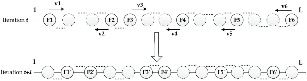 When the proposed GPSO-based feature selection algorithm is used in the field of multiple features objected based change detection, the essential step is how the features are selected from the feature set. After the features have been extracted from the image object and the features set has been built in the field of OBCD, we give each feature an index, then these feature indices have been selected by GPSO-based feature selection algorithm. Figure 1 explains how the feature indexes update in the iteration of GPSO algorithm, and it illustrates one particle before and after one iteration step when selecting six features from the image object feature set which has L features. At the t-th iteration, six features are selected by each particle, x(t) = (F1,F2,…,F6)T, and GPSO determines the update v(i) = (v1,v2,…,v6)T. At the (t + 1)-th iteration, the selected feature indices becomes x(t + 1) = (F1’,F2’,…,F6’)T. According to the Figure 1, one particle xi denote a kind of feature combination, also can be regarded as a potential solution for the feature selection problem. At the end of iterations, the feature indices included in the best global solution gbesti of the particle swarm is the optimal result of feature selection.