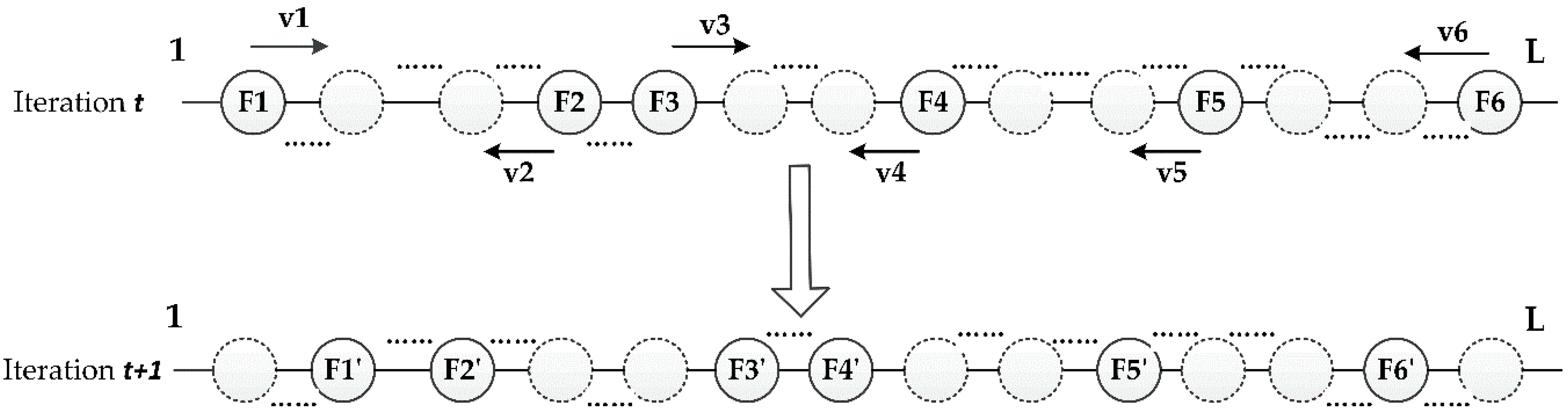 - Step 4: Update the position and velocity vectors of each particle using Equations (1)–(6);