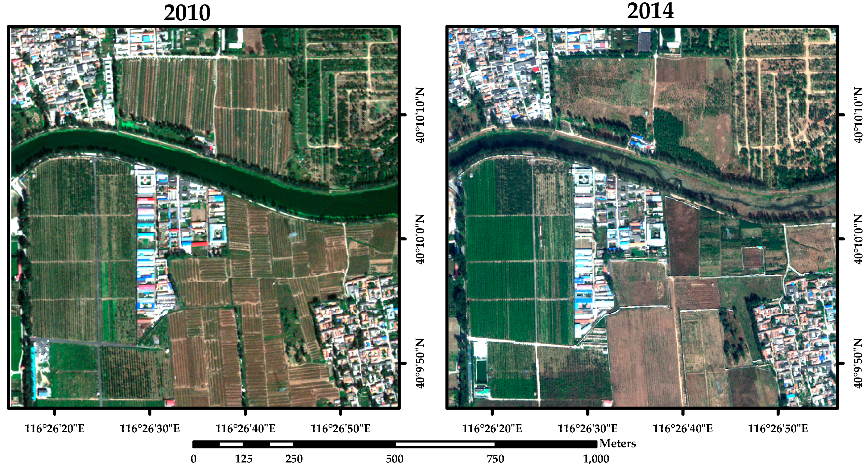 True color synthesis of images of study area nearby the Modern Agricultural Demonstrative Garden of Beijing (China) acquired by Worldview-2/3 VHR multispectral sensor on: (a) 27 September 2010; and (b) 20 October 2014.