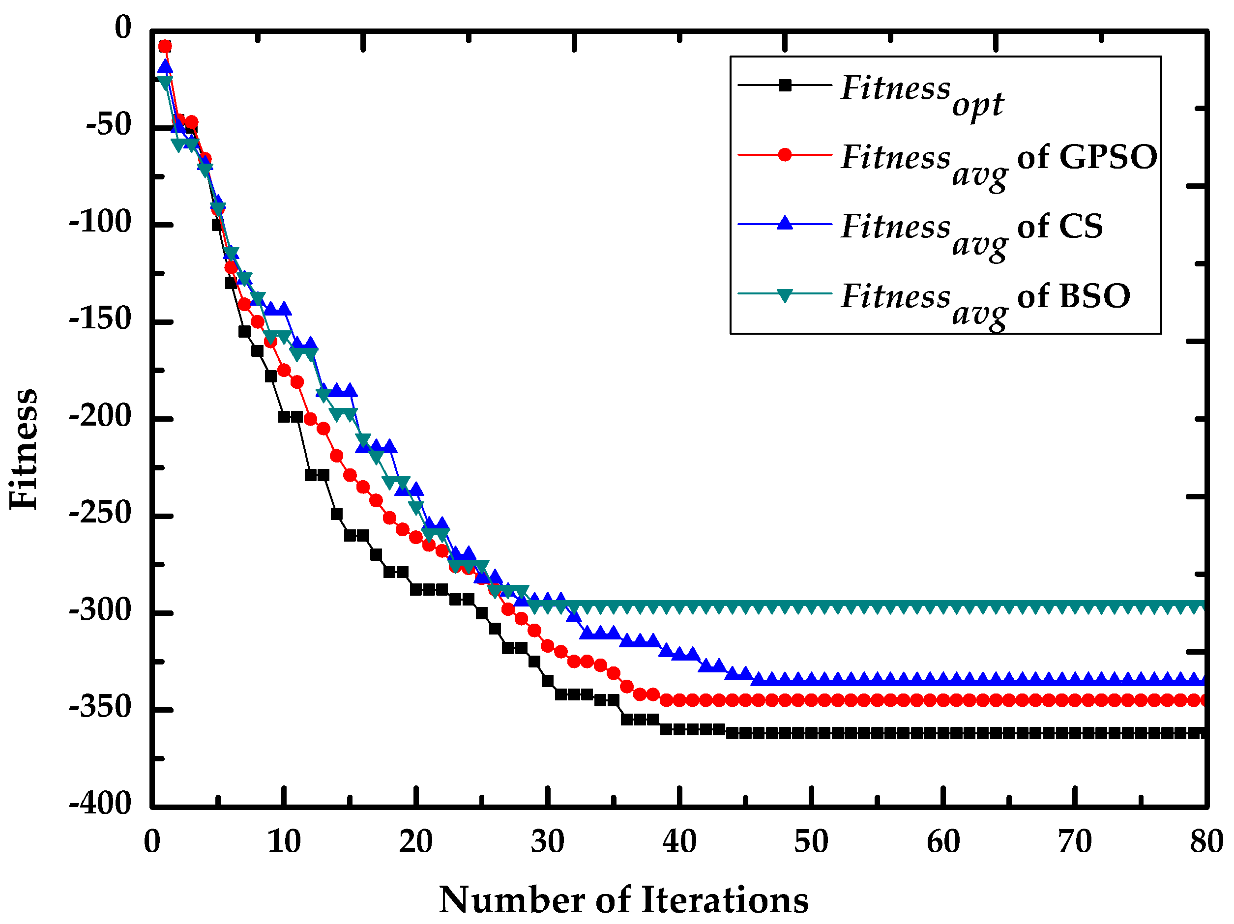 In Table 2, Iterationcon is the number of iterations required for the algorithm to converge, and Dcon is the difference between the final values of fitnessavg and fitnessopt. As indicated in Table 2 and Figure 4, BSO has the fastest convergence speed, but Dcon for BSO is much larger than in the other cases, which means that BSO tends to convergence locally. Conversely, CS escapes local optima but has a slower convergence speed than GPSO. The optimum final value of fitnessavg is obtained by GPSO and the convergence curve are more stable than in the others. Additionally, the parameters of Dcon for GPSO in different cases are close to each other. The result reveals that GPSO is superior at finding optima avoiding premature convergence compared with CS and BSO.