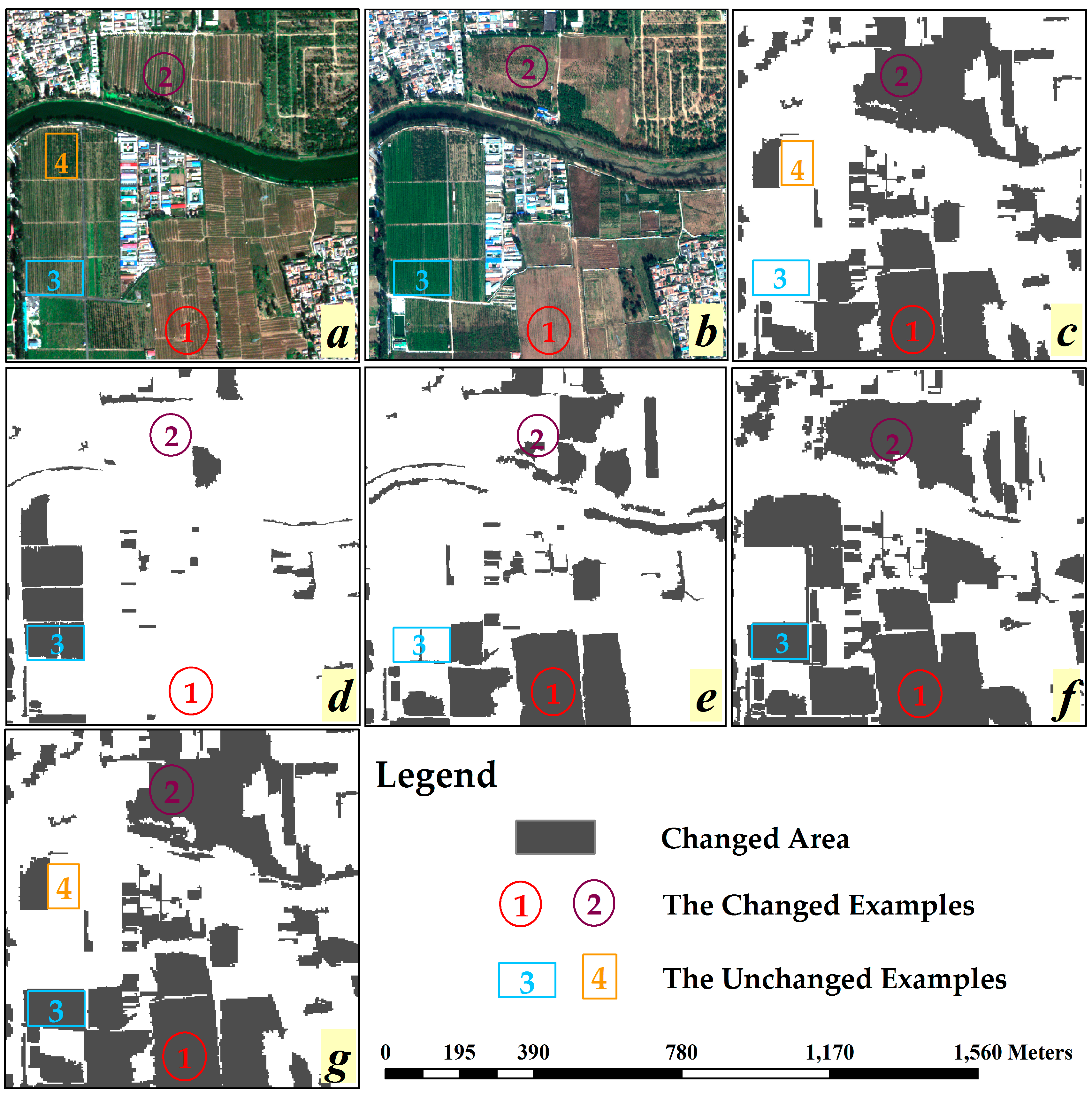 Figure 5 illustrates the OB-HMAD results of Case A for single and multiple features selected by the BSO, CS and GPSO algorithms, where Figure 5a,b shows the original images, Figure 5c is the reference map obtained by the ground truth data, Figure 5d shows the OBCD result with a single spectral feature (average of bands), and Figure 5e–g shows the OBCD results with multiple features. Figure 5d is significantly different from Figure 5c as well as the other subfigures, containing several false negative errors and false positive errors. To analyze the problems of missing detection and false detection, four examples are shown in Figure 5. According to the reference data, changed areas 1 and 2 relate to the missing detection problem, and unchanged areas 3 and 4 relate to the false detection problem.