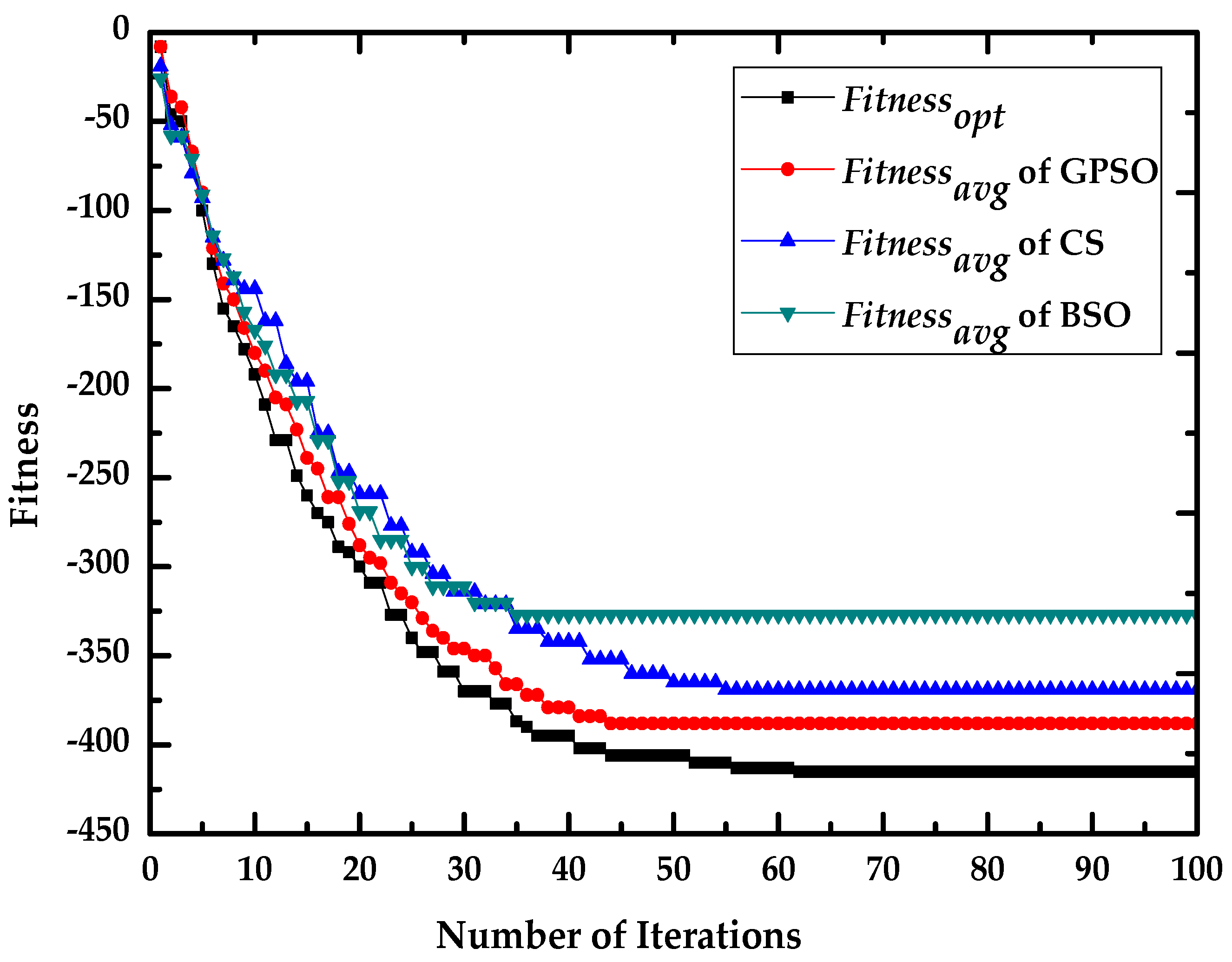 Comparison analysis of fitness convergence with BSO, CS and GPSO in Case B.