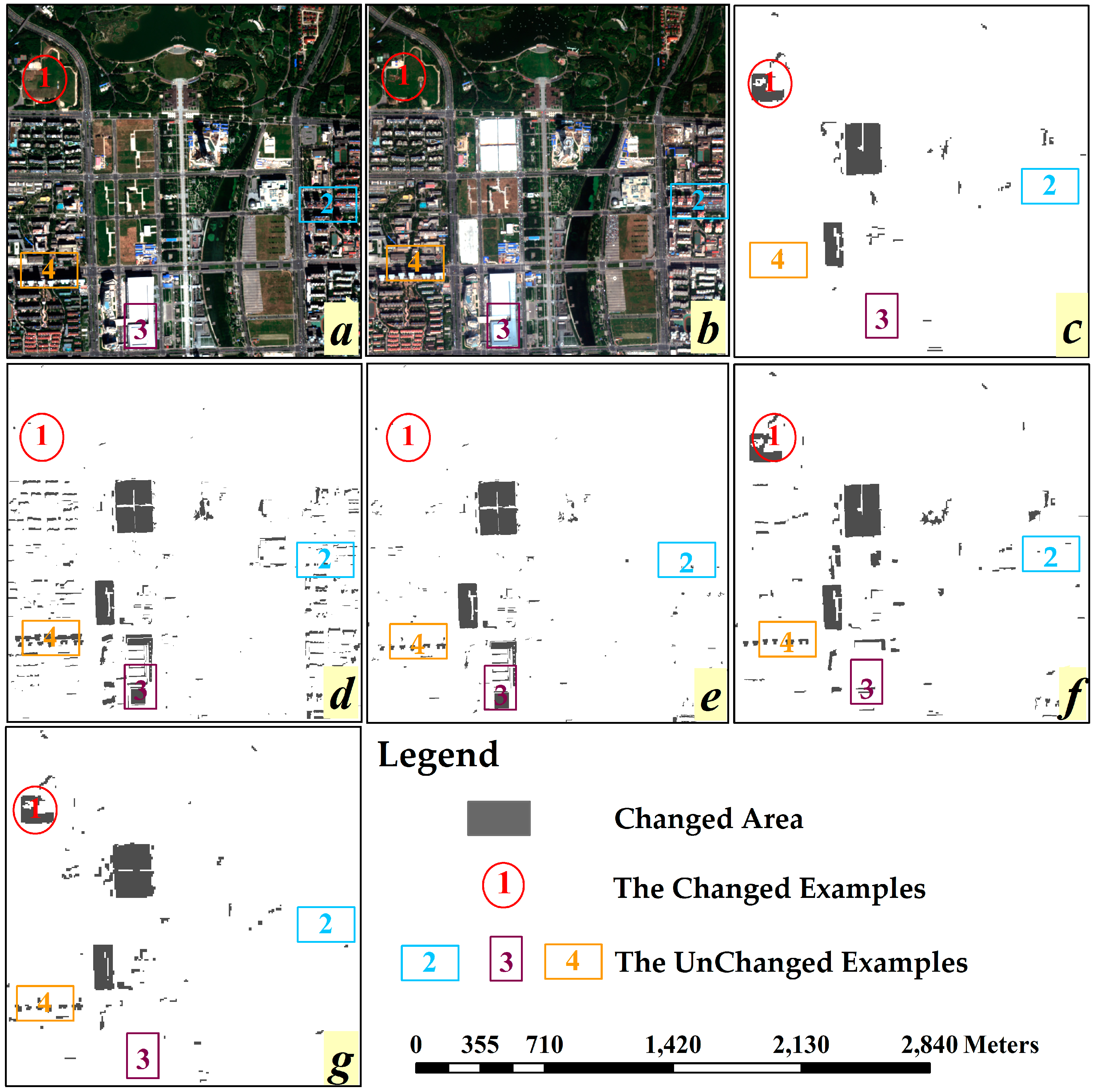 Similar with the results analysis of Case A, the results of Case B have also been divided into several subfigures, as shown t in Figure 8. By analyzing the four example area in Figure 8, we can obtain similar results with Case A: OBCD with single spectral feature has poorer performance than ones with multi features, and Figure 8g is close to the Figure 8c, which means the OB-HMAD result with multiple features selected by GPSO is the closet to the real situation. Besides, Figure 8d,e has some missing detection problems in terms of area 1, while Figure 8e–f has some false detection problems in terms of area 3, these mistakes, caused by different illumination angle, can be corrected with the assistance of GLCM-Homogeneity. The false detection caused by the shadow of a high building can also be avoided with the assistance of texture features, as can be seen in area 2. In particular, area 4 is a pseudo-changed area and this pseudo change is caused by the difference of shooting angle of sensor. This area has been mistakenly identified as changed area by these algorithms but has not changed.