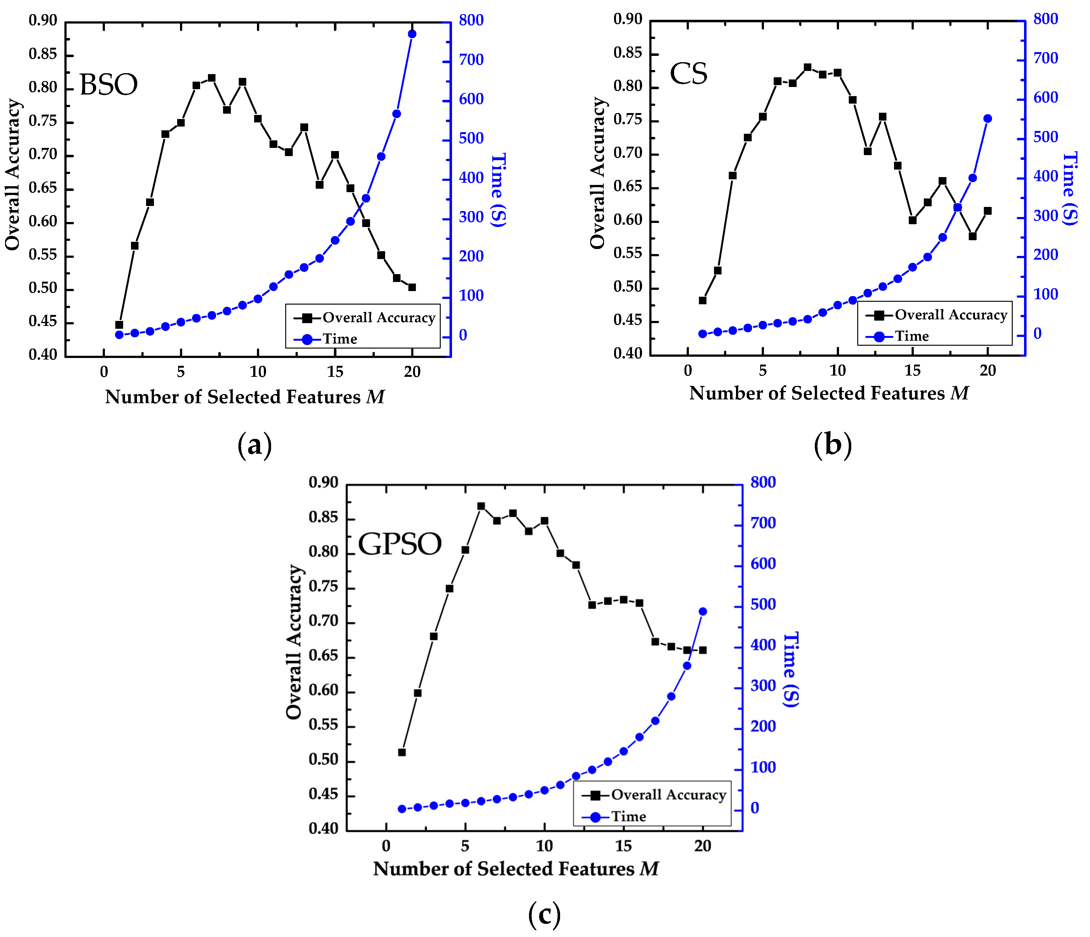 In Figure 9 and Table 8, the overall accuracy of the algorithm increases steadily as M increases from 1 to 9; however, when M ≥ 10, the accuracy decreases. Increasing M drives an increase in the running time, particularly when M ≥ 10. Taking into consideration the accuracy and efficiency of the algorithm, the optimum number of features to select is six to eight. Compared with CS and BSO, GPSO has the best performance in terms of accuracy, as the maximum and mean values for GPSO are higher than in the other cases, and the standard deviation and average change rate are both lower than in the other cases. This means that GPSO is less sensitive to the number of features to be selected and is less susceptible to the influence of the initial value.