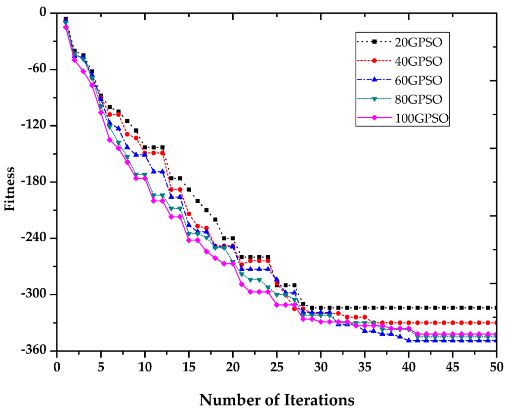 In Figure 10 and Table 9, the convergence speed and running time of the algorithms increase as N increases, but the final converged fitness values, which represents the error rate of the algorithm, are similar, except in the case of the 20GPSO algorithm. While the algorithm converges faster in this instance, the final converged fitness value is higher, meaning that 20GPSO has a problem with premature convergence. Overall, 60GPSO has the minimum converged fitness value, so we consider that GPSO with N = 60 has the best performance in terms of precision and running time.