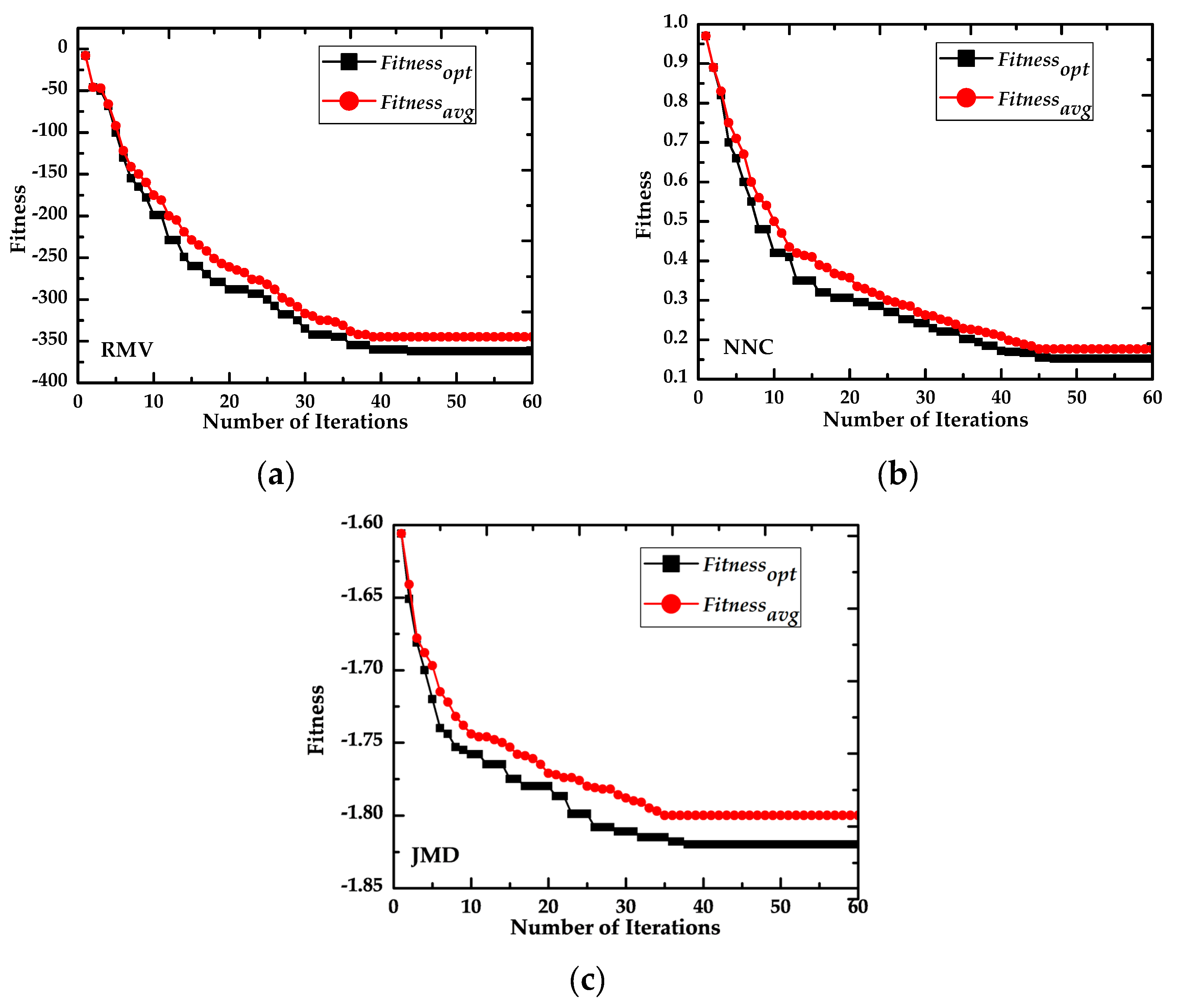 Comparison of fitness convergence with different fitness functions: (a) RMV (Ratio of Mean to Variance); (b) NNC (Nearest Neighbor Cassifier); and (c) JMD (Jeffreys–Matusita Distance).