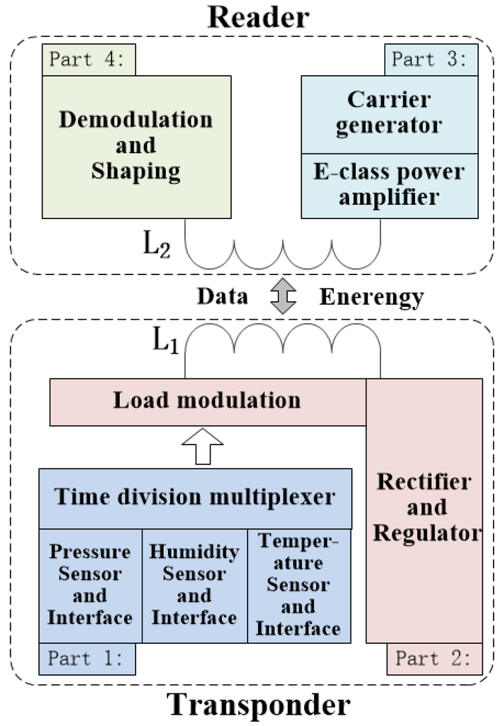 The working process of the system is as follows. Firstly, the carrier generator together with the E-class power amplifier in the reader generates a carrier signal. Then, the carrier signal in the reader is coupled to the transponder though their inductors. The coupled carrier signal in the transponder is then rectified and regulated as the voltage source for itself. With sufficient power supply, the temperature, humidity, and the pressure sensors together with their interfaces in the transponder can each generate a digital frequency signal, whose value is decided based on the environment. In order to realize the monitoring of multiple environmental parameters, the time division multiplexer is used to sequentially transmit three digital frequency signals. Then, the output signals of the time division multiplexer are modulated to the carrier signal by the load modulation circuit in the transponder, and the modulated carrier signal is, at the same time, coupled back to the reader. Finally, the digital frequency signals generated by the sensors and their interfaces are recovered from the modulated carrier signal by the demodulation and shaping circuits. The detail designs of the transponder and the reader are given below.