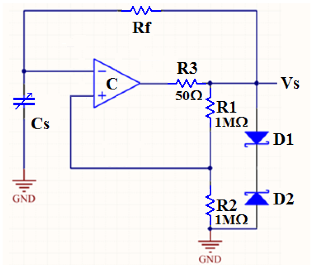 Figure 2 shows the schematic of the multi-harmonic oscillator. In Figure 2, the capacitor Cs represents a capacitive sensor. During the circuit design process, we use variable capacitors to represent capacitive sensors. The resistor Rf and the op amp constitute an integral circuit, which plays the role of frequency selection. The resistance R1 and R2 constitute the positive feedback circuit, and the diode D1 and D2 have the function of bidirectional limiting of voltage. The output frequency f of the multi-harmonic oscillator can be calculated by [19]:
