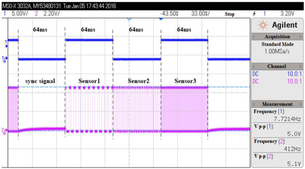 There are three kinds of environmental sensors integrated in the transponder, but the monitoring system has only one data transmission channel. Therefore, the time division multiplexer is used to realize the time division multiplexing transmission. The time division multiplexer consists of the oscillator, the frequency divider and the multiplexer. Figure 3 shows the output signals of the time division multiplexer. It can be seen that the sync signal and the signals of three sensors are sequentially outputted, and the transmission time for each signal was designed to be 64 ms.