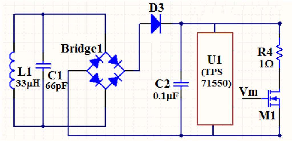 Schematic of the rectifier, regulator, and load modulation circuit. L1 is the planar inductor that receives the carrier signal from the reader. The diode bridge plays the role of rectifier. The diode D3, together with the capacitor C2, filters the signal after rectification. The regulator chip U1 (TPS71550) is used to make the dc voltage more smooth and stable. The NMOS transistor M1 as well as the resistor R4 forms the load modulation circuit.