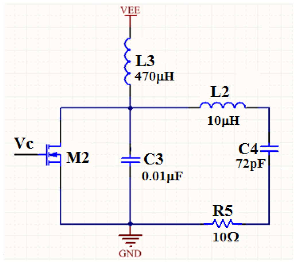 In our passive wireless sensing system, the carrier signal not only transmits sensor data but also provides power for the transponder. Therefore, a carrier signal with large amplitude is needed. Firstly, an oscillator chip LTC6900 [22] is used to generate a 50% duty cycle square wave. The output frequency of LTC6900 is adjustable from 1 kHz to 20 MHz, which is high enough for our system. However, the amplitude of the output wave is less than 5 V, which is too weak to power the transponder. Hence, the output of the oscillator chip needs to be amplified. The E-class power amplifier, which has very high efficiency, is used here to amplify the output wave of the oscillator chip. Figure 6 shows the schematic of the E-class power amplifier. Vc is the output wave from the oscillator chip. If the capacitance of C3 and (in parallel) the MOS transistor M2 and the parameters of the LCR branch (L2, C4, and R5) are regulated just right, the LCR branch will be on its resonant state and the carrier amplitude on inductor L2 will reach the maximum value. When the LCR branch is on its resonant state, the amplitude of the output carrier signal will be decided by the dc power supply of the E-class amplifier. The output amplitude of the carrier signal reaches 63 V when the dc power supply is set to 12 V.