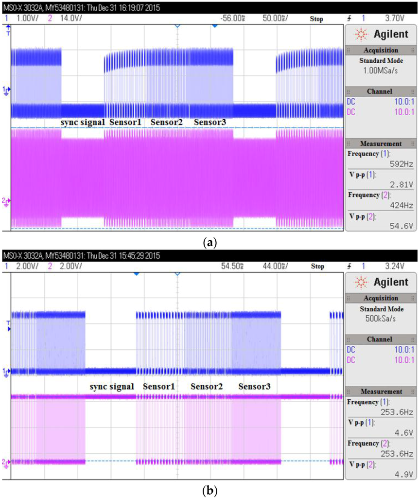 Figure 5 shows the signal waves of the load modulation circuit. In Figure 5a, the bottom wave is the unmodulated sensor signals from the time division multiplexer, the top wave is the modulated carrier signal at the transponder inductor. In Figure 5b, the bottom wave is the modulated signals at the transponder inductor, and the top wave is the modulated carrier signal at the reader inductor. It can be seen that the sync signal and the three sensors’ signals are successfully modulated to the carrier signal. The frequency of the carrier signal in our system is 5.1 MHz.