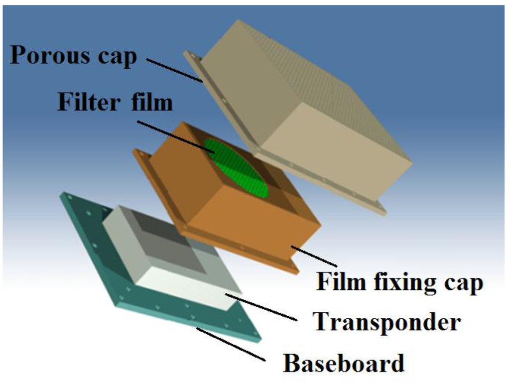 Schematic of the package of the transponder. Firstly, the transponder is mounted on the baseboard. Then, the transponder is covered with the film fixing cap. The filter film on the film fixing cap is used for resisting paint mist. Finally, the film fixing cap is covered with the porous cap, which is used for blocking dust and large particles.