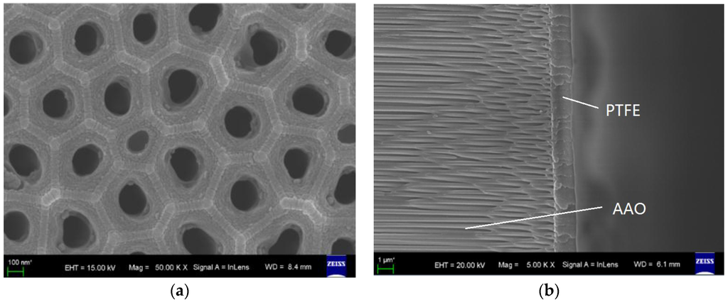 SEM photographs of the aluminum anodic oxide/polytetrafluoroethylene (AAO/PTFE) composite film (a) the surface view; (b) the section view.