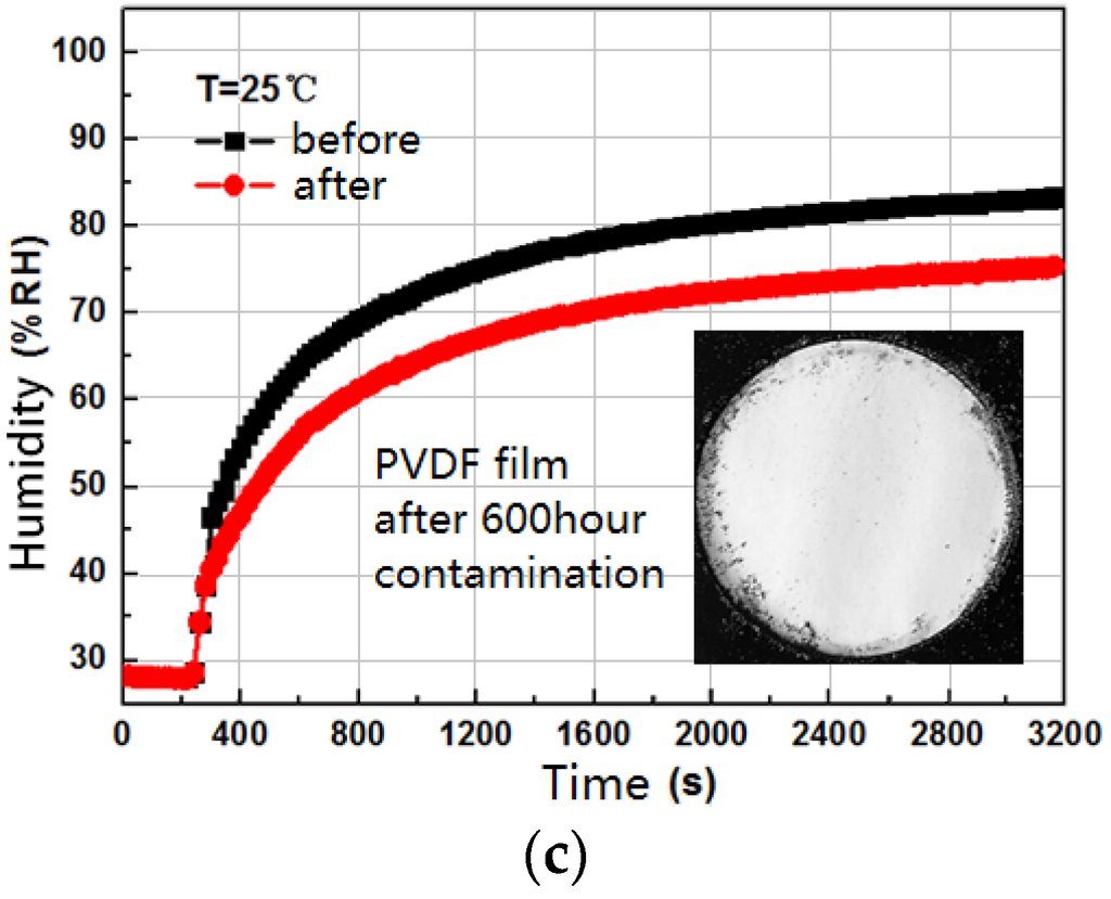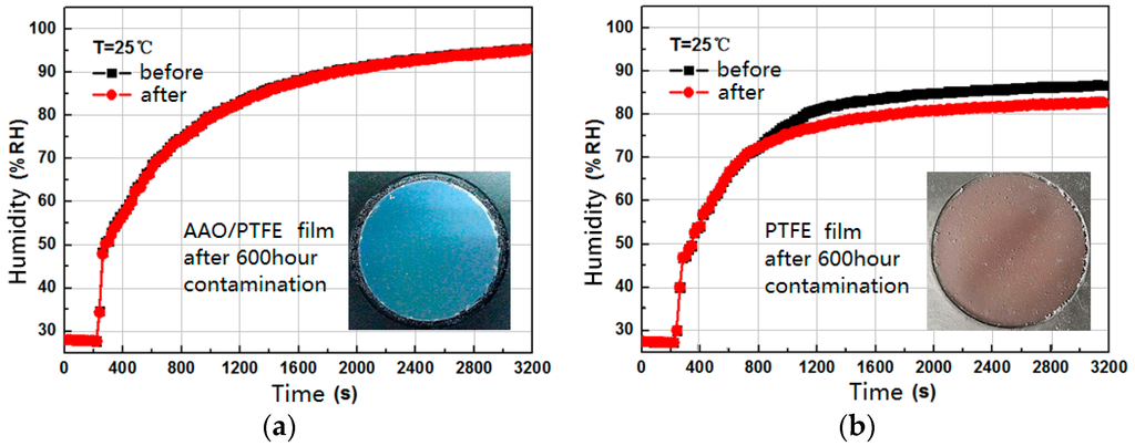 A contrast experiment was carried out to compare the performance of the fabricated composite filter film with two other kinds of filter films, PTFE film and polyvinylidene fluoride (PVDF) film. The PTFE and PVDF films are both large-scale commercial polymeric materials. They have good air permeability, good corrosion resistance, and low surface tension. Other films that have similar properties as above, such as polypropylene films [25] and Nafion films [26], may be possible candidates. Here, we mainly investigated the change of water vapor flux and the antipollution properties of each filter film after being exposed for a long time to pollution in the spray painting workshop. Figure 12 gives the transient responses of the humidity sensors before and after 600 h paint mist contamination; the sensors were covered by the AAO/PTFE film, the PTFE film, and the PVDF film, respectively. The photographs of the polluted films are also shown in Figure 12. It can be seen that, after a long time period of working in the spray painting workshop, the composite filter film AAO/PTFE has the minimum pollution and the smallest change of water vapor flux.