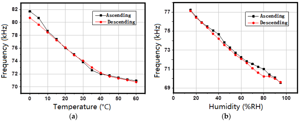 Output frequency versus (a) temperature; (b) humidity; (c) pressure.
