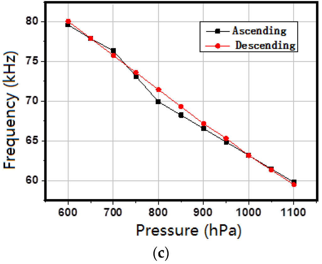 The pressure characterization of the passive wireless monitoring system was measured by the GY-600 pressure chamber (made by XiangHe, GuoRuiZhi Test Equipment Co., Ltd., Beijing, China). The measured relationship between the pressure and the output frequency is shown in Figure 13c. The variation of the output frequency is about 21 kHz when the pressure changes from 600 hPa to 1100 hPa. So the pressure sensitivity of the monitoring system is 42 Hz/hPa.