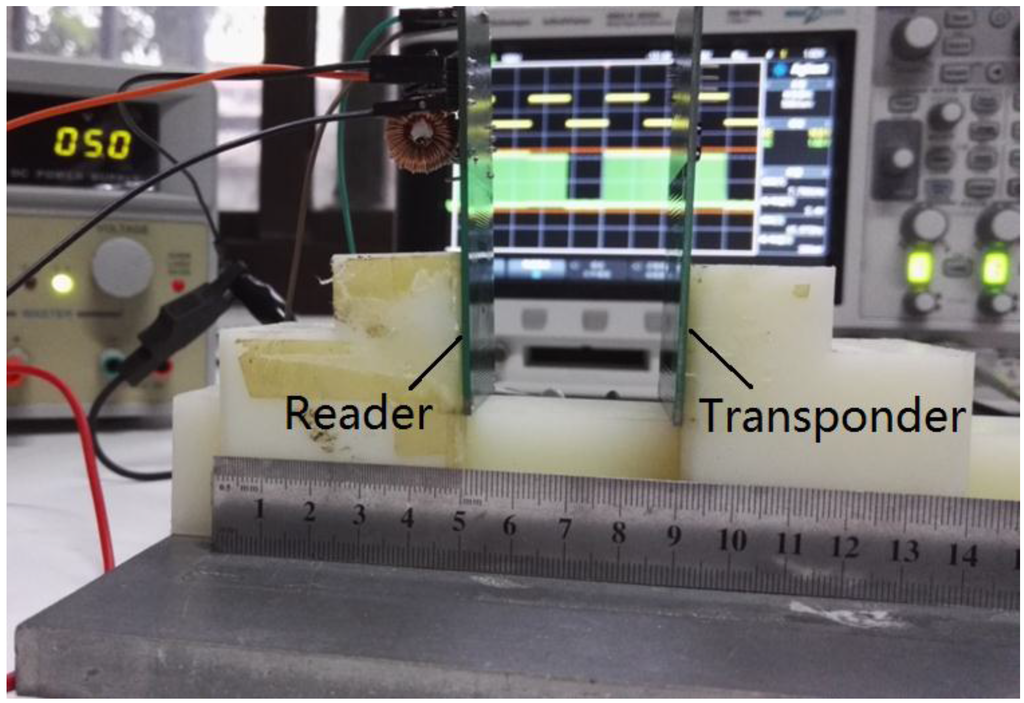 The passive wireless transmission distance of the monitoring system was also measured. The test platform as well as the measurement result is shown in Figure 14. When the distance between the transponder and the reader reaches 4 cm, the output signal of the reader is still working properly. Under fixed inductor size and input power, adjusting the resonant frequency of the transponder and the reader to the carrier signal frequency could be an efficient way to increase the telemetry distance. Because the wall of the spray painting workshop is made of glass, the effect of glass in the distance measurement needs to be considered. However, the measurement result shows that glass has no influence on the passive wireless sensing distance.
