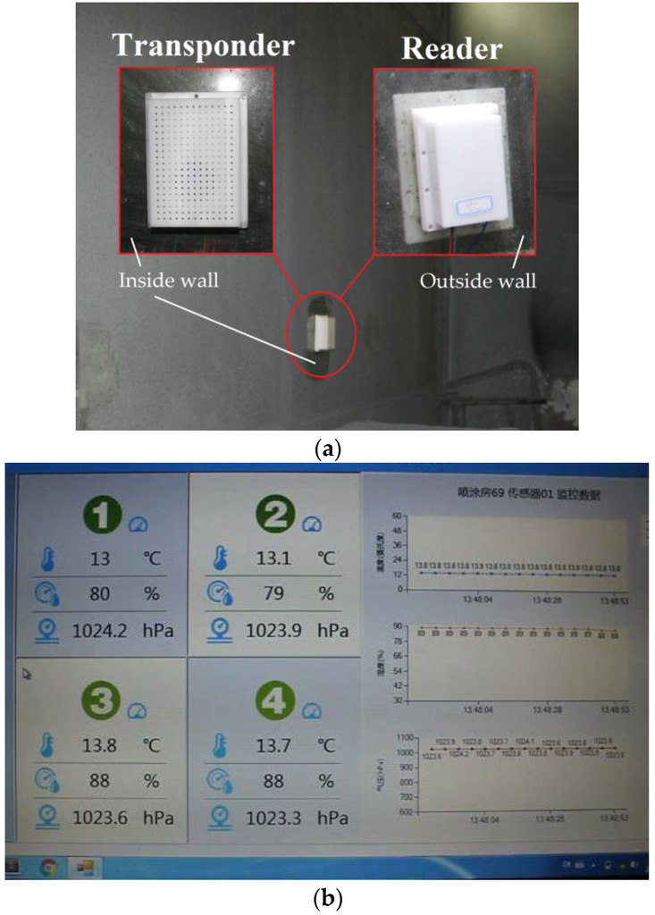 Demonstration of the monitoring systems in spray painting workshop (a) Installation of the transponder and reader on the glass wall of the spray painting workshop; (b) A screenshot of the monitoring software showing both real-time data and history records.
