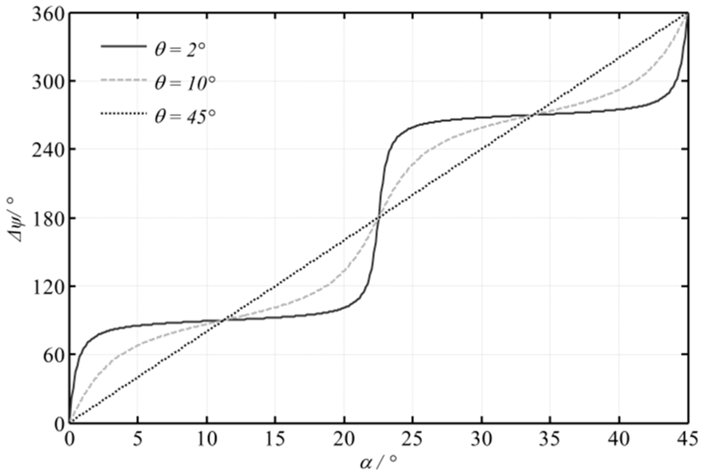 where is a constant during the measurement. Generally, the relationship between ∆ψ and α is nonlinear unless θ = 45°. Figure 2 shows the relationship between ∆ψ and α with differing θ. However, in a small range, a nearly linear segment can be found and it has a steep slope, which provides high sensitivity. Then, the relationship of ∆ψ and α is simplified as [8,11,12]: