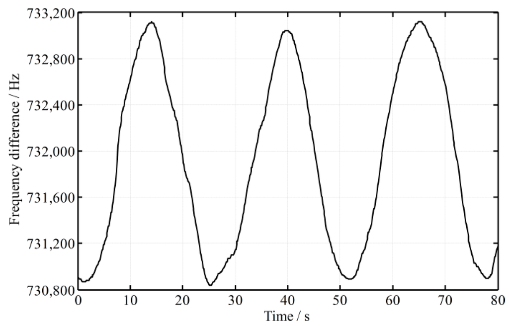 In practice, temperature, atmospheric change, mechanical vibration, magnetic field, etc., all of these will cause the frequency instability, which result in the frequency difference (f1 − f2) constantly changing. The fluctuation of the frequency difference of a He-Ne Zeeman dual frequency laser is shown in Figure 3. From Figure 3, it is known that the frequency difference changes periodically and approximately sinusoidally over time, so the frequency difference can be described as: