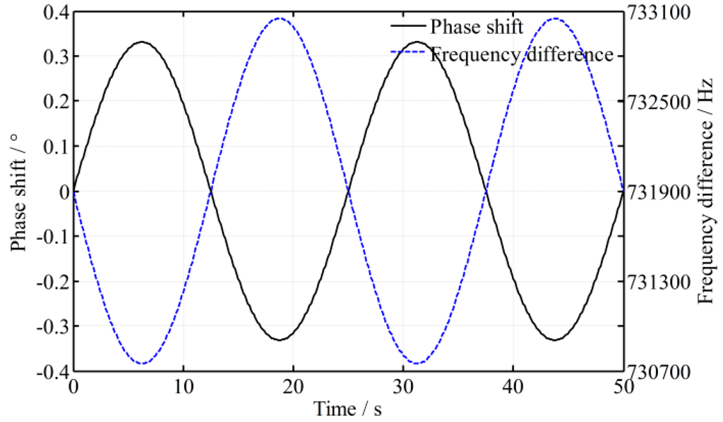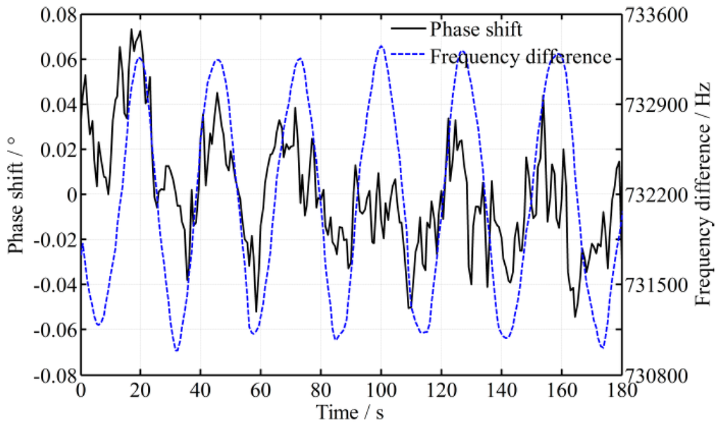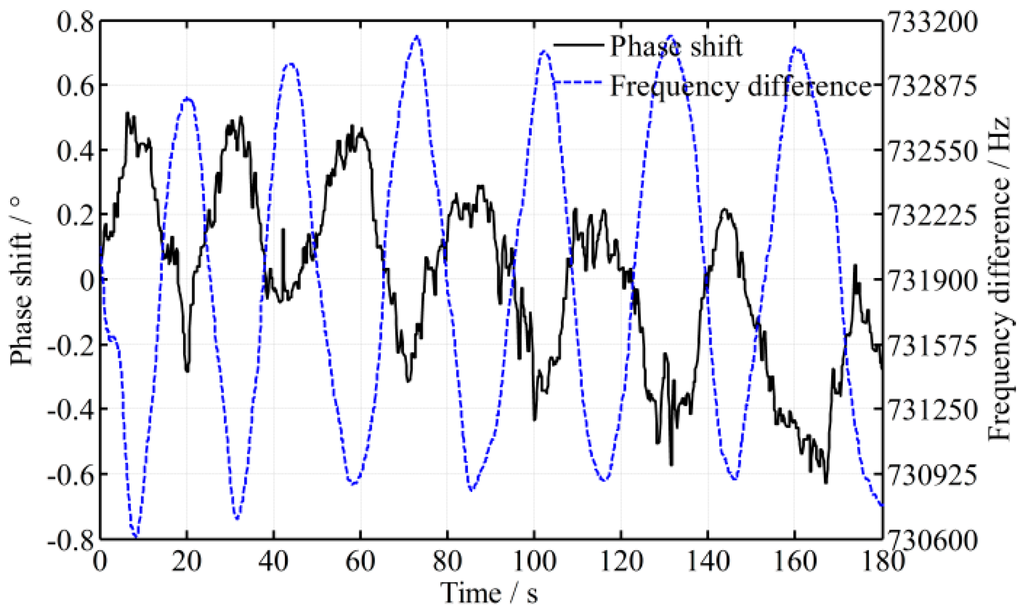 Theoretically, the phase items containing the frequency difference (f1 − f2) in Equations (3) and (5) can be subtracted. However, an additional phase shift would be generated because of the frequency fluctuation and the time difference of the signal response between the measurement and reference beams. Here, it is discussed below in detail.