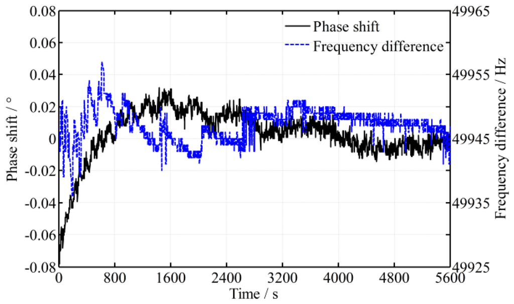 From Equations (11) and (12), it is known that any additional phase will not exist when ∆t = 0, but three additional phase items will be generated when ∆t ≠ 0. The first additional item (2πf0∆t) can be regarded as a constant when the system is stable; thus it does not cause fluctuations and usually is regarded as a part of the definite phase difference ϕ0. The second and third additional items, (2π∆ft) and ψF, vary over time and generate fluctuation errors in the phase shift.