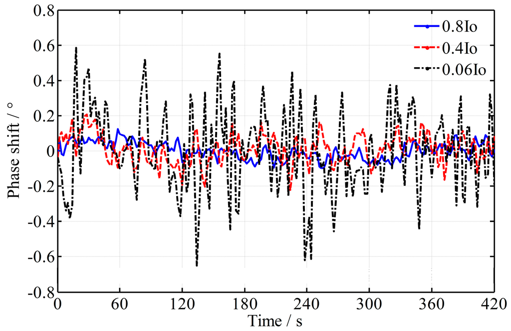 When Ka = 114 and ∆ψF = 0.70°, a fluctuation error of the roll angle test 22″ will be generated. It does not meet the high-precision of the roll angle measurement. Practically, two photodetectors of the same model are generally adopted in practical measurements. In this study, two photodetectors of the same model (Thorlabs PDA36A) are employed, and the experiment result is shown in Figure 6. Comparing with the results from two different model photodetectors as shown in Figure 5, the fluctuation of the phase shift is reduced to 0.10°, which is much less than the aforementioned 0.70°. That is consistent with the theoretical analysis, and the time difference is estimated to be reduced to about 100 ns. Obviously, the time difference affects the phase fluctuation greatly, even a slight time difference also results in an obvious phase fluctuation; and choosing the photodetectors with good consistency is the basis for high-precision phase metering.