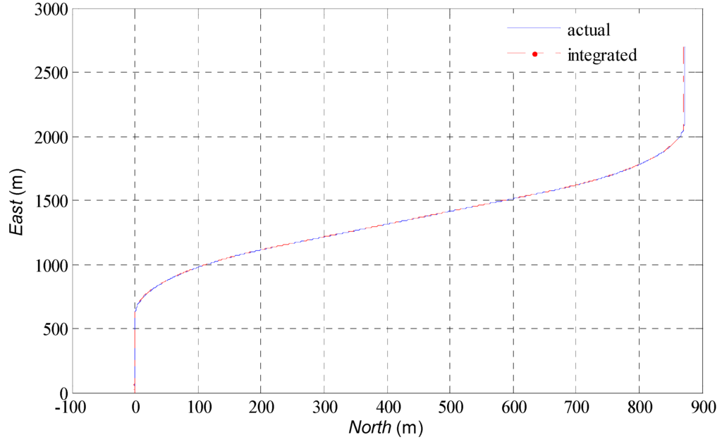 A simulator with the module of USV trajectory simulation and the raw measurements simulation for IMU and GPS was developed. The trajectory used in this simulation scenario is illustrated in Figure 3. We assume that the USV is operating at sea level. The sliding mode controller in [15] drives the USV fallowing the designed trajectory. To represent a real MEMS-IMU as closely as possible, different error types including the Gaussian model and random bias were induced in the simulated IMU. Raw GPS pseudorange and Doppler measurements were simulated at a 1 Hz rate, while the IMU raw data were simulated at a 100 Hz rate. The sensor error characteristics of MEMS-IMU are given in Table 1. The program is implemented in MATLAB R2013a using Intel Xeon E31270 CPU and 8 GB RAM.