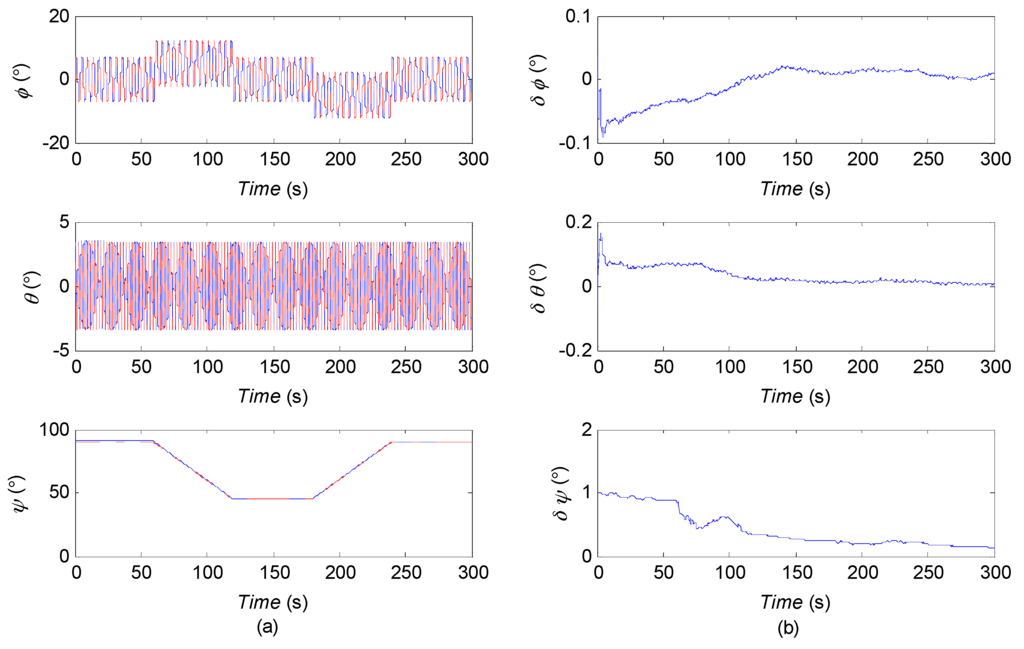 (a) roll, pitch and yaw of the USV; (b) estimation of the attitude errors (transformed from quaternion to corresponding Euler angles).