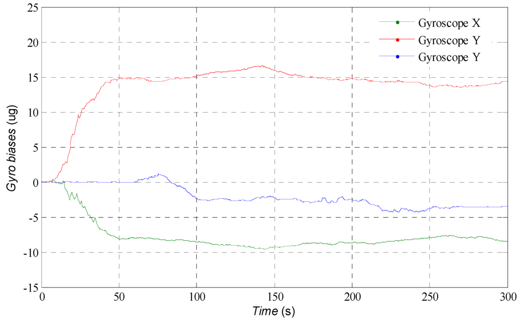 Figure 3 shows the estimation results of trajectory of USV in horizontal plane. Although the low cost MEMS-IMU is used, the agreement with the actual trajectory is generally good. The estimated position and velocity errors can be found in Figure 4. After the initial transient, the estimation error in the north direction remains less than 3 m approximately, 0.5 m in the east direction and −4.2 m in the down direction; the errors of velocity remain within a region of approximately ±0.05 m/s. In Figure 5, the attitudes estimated by the AUPF algorithm (using quaternion) are plotted. The quaternion are converted to their corresponding Euler angles. Except the initial transient, the roll and pitch errors remain mostly in the region ±0.1 deg, but the yaw error tends to be a little larger. Accelerometer bias estimation results are illustrated in Figure 6. Gyroscope bias estimation results are plotted in Figure 7. Due to the fact that the yaw angle is the least observable state in practical vehicle motion, we can see form Figure 7 that the bias error on the z-axis takes more time to be stable.