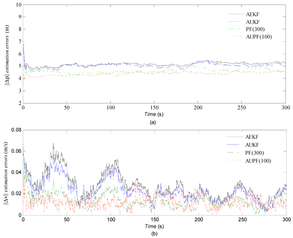 In order to illustrate the performance of the proposed AUPF algorithm, several groups of tests adopting the AEKF, AUKF, PF and AUPF are conducted, respectively, in this part. For comparing the navigation accuracy among the algorithms mentioned above, we choose the norm of the position () and velocity () estimation errors for analysis, which are calculated as . As shown in Figure 8, AUPF presents best estimation accuracy compared with others.