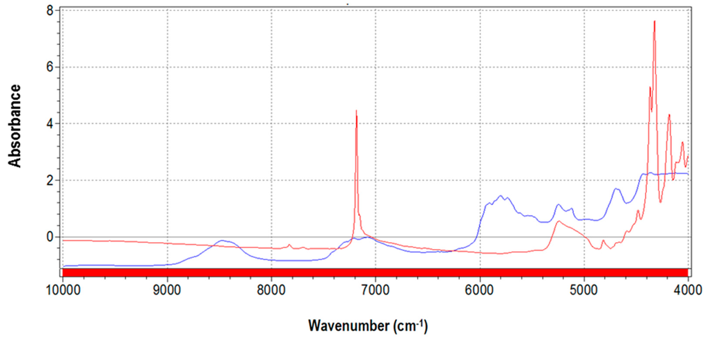 Pure talc shows the typical sharp peak at 7185 cm−1 due to fluorine content [30], whilst the PLA spectrum is principally characterized by absorptions at 8400 cm−1 and in the interval 6000–4700 cm−1 [31].