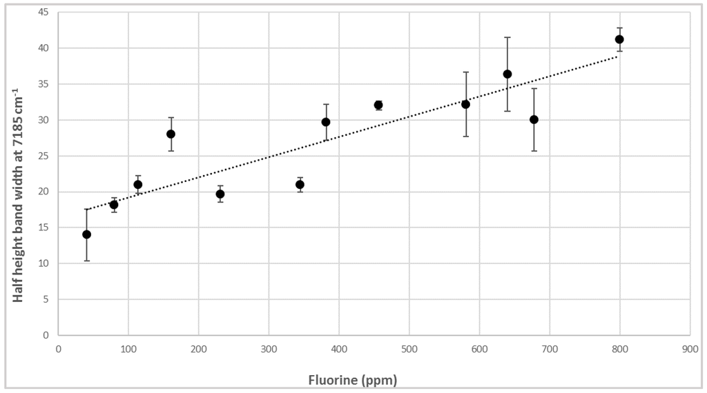 Correlation between half height band width at 7185 cm−1 and fluorine content in samples of PLA–talc blends.