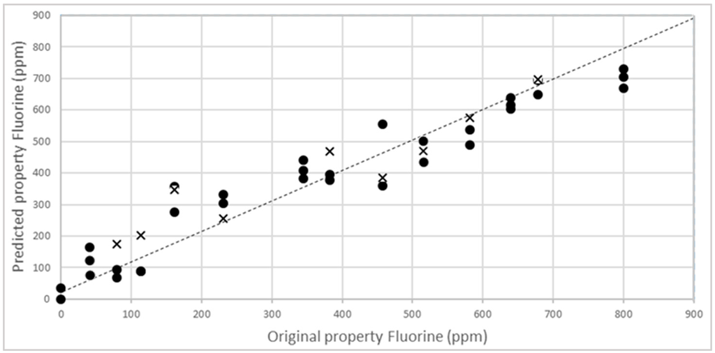 To obtain a reliable model to be applied with unknown samples, the external validation step is fundamental. In fact, the cross-validation procedure is not sufficient to prove the predictive ability and the robustness of the calibration, especially when multi-components and solid samples have to be analysed. Matrix effects, structural complexity and non-homogeneous samples surface, sample composition, and low concentration of parameter of interest could strongly influence the model performance. External validation has to demonstrate the performance of the chosen model for future (unknown) samples, using an independent validation set consisting of samples that have not be used in the creation of the calibration [41]. Accordingly, 15 other new PLA-talc blend samples were created, as described above, and NIR spectra acquired and then analysed with the reference analytical method. In Figure 7, external validation results are shown in terms of NIR-predicted fluorine values vs. concentration obtained with alkali digestion method.