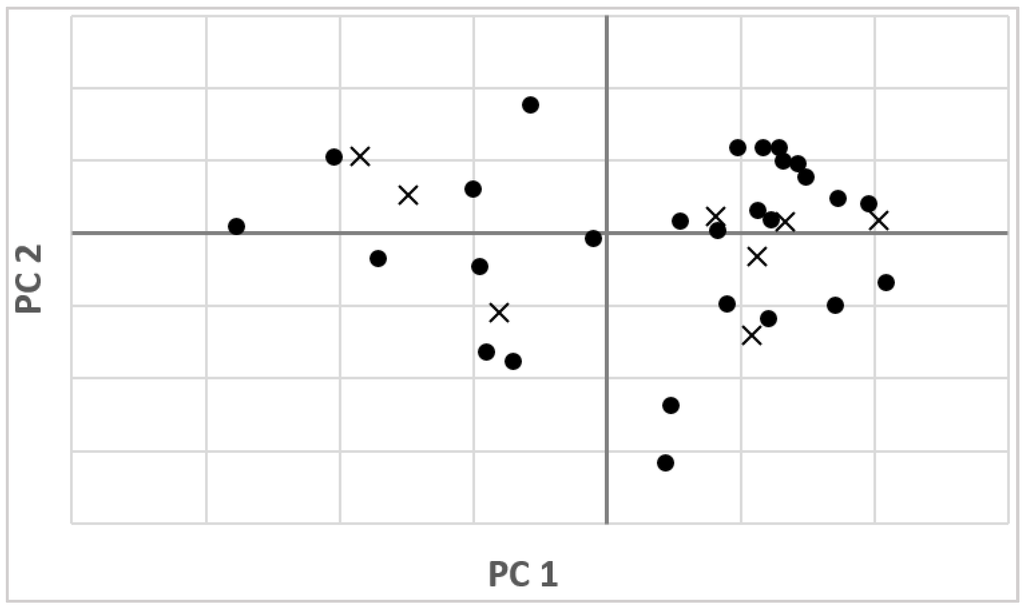 Score plot of the first and second principal components (PCs) of pretreated spectra, in calibration (●) and validation (×) sets