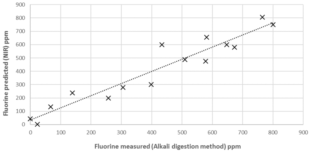 External validation. The calibration for fluorine was then validated by means of external validation: 15 new independent samples were acquired to obtain additional data and evaluate the predictive capability of the model. The prediction accuracy was considered in terms of squared correlation coefficient (R2EX.V) and root mean standard error of prediction between predictions and reference values (RMSEP). Finally, the standard error of the laboratory (SEL)—i.e., the error of the reference data—was reported in order to allow a comparison between that value and the NIR performance (SEC and RMSEP).