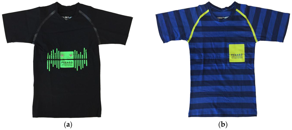 The comparison of the two male versions of the first set of sensorized t-shirts: (a) the style with technical textile and the visible device to be attached to the two snap buttons; (b) the style with a more fashionable colour and the sensing device hidden into the pocket where the two connecting snap buttons are placed.
