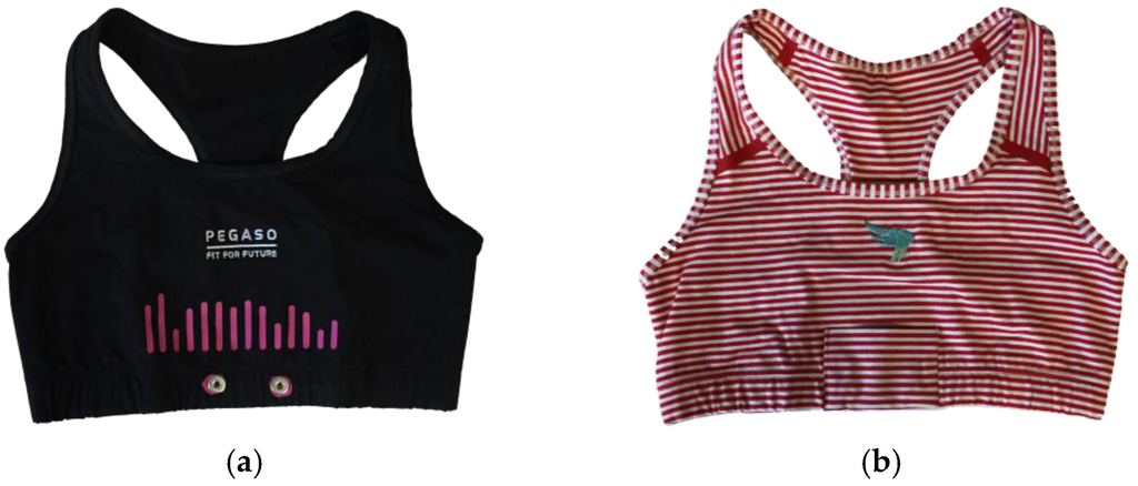 The comparison of the two female versions of the first set of sensorized bras: (a) the style with technical textile and the visible device to be attached to the two snap buttons; (b) the style with a more fashionable colour and the sensing device hidden into the pocket where the two connecting snap buttons are placed.