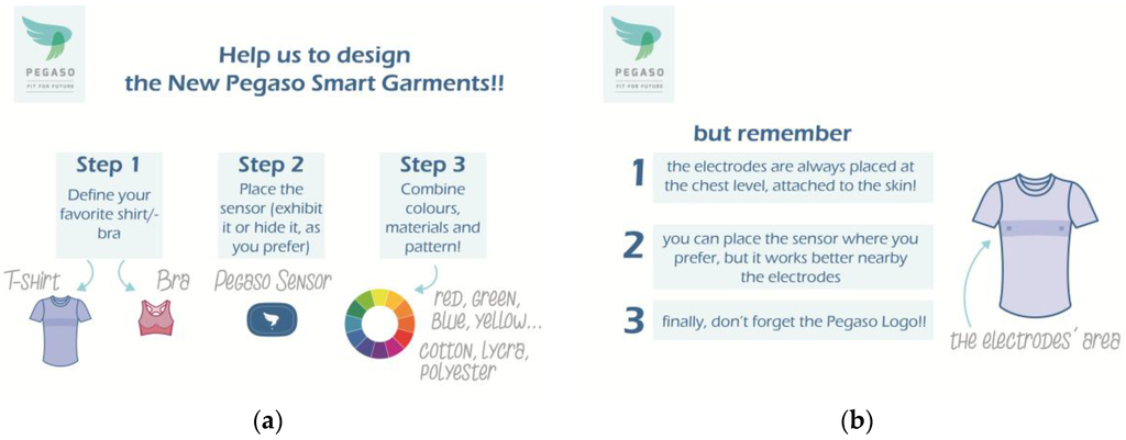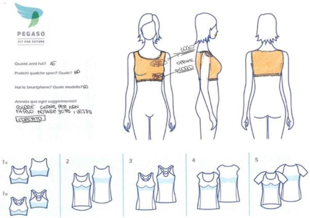 In addition, some design samples of PEGASO garments (two sport t-shirts and two sport bras) were shown, to investigate the most important features that the teenagers consider relevant to improve the acceptance of the wearable apparel. The third phase was specifically dedicated to co-design activities as will be explained in detail in the next paragraphs.