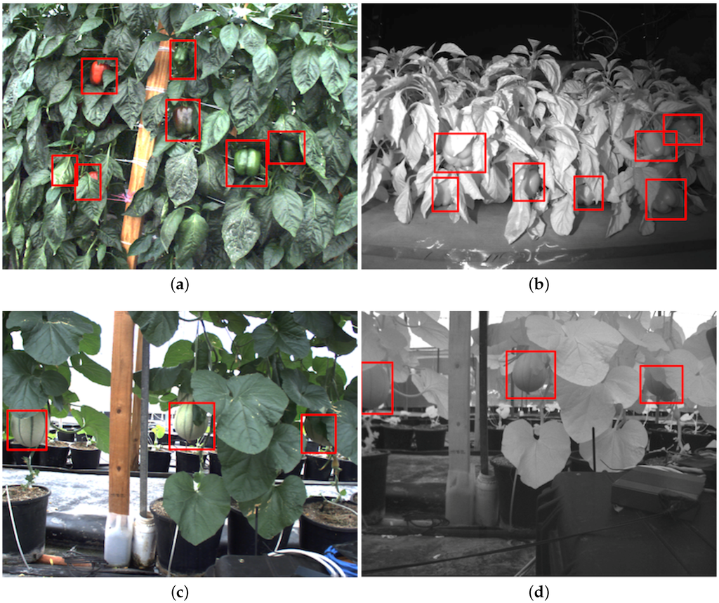 Example images of the detection for two fruits. (a) and (b) show a colour (RGB) and a Near-Infrared (NIR) image of sweet pepper detection denoted as red bounding boxes respectively. (c) and (d) are the detection of rock melon.