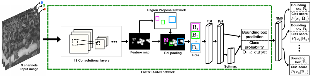Illustration of test time the Faster Region-based Convolutional Neural Network (R-CNN). There are 13 convolutional and 2 fully-connected (Fc6 and Fc7) and one softmax classifier layers. N denotes the number of proposals and is set as 300. is the output that contains N bounding boxes and their scores. Non-Maximum Suppression (NMS) with a threshold of 0.3 removes duplicate predictions. is a bounding box of the K-th detection that is a 4 × 1 vector containing the coordinates of top-left and bottom right points. is a scalar representing an object being detected.