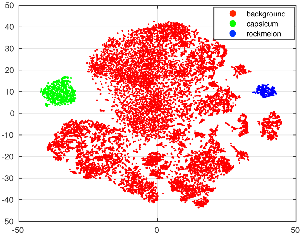 Four thousands ninety six dimensions of feature vectors are extracted from the fully-connected 7 (fc7) layer and are fed into t-Distributed Stochastic Neighbour Embedding algorithm (t-SNE) [32] with the corresponding labels. t-SNE is one of the popular dimensionality reduction methods that measures pairwise neighbouring similarities using the L2 norm distance in both high and low dimensions. The pairwise similarities are calculated around the sample points, and the Kullback–Leibler divergence is used to gauge the distance between two probability distributions (i.e., the similarities of high and low dimensions). Stochastic Gradient Decent (SGD) minimises the distance to keep the local structure in a low dimension space. Figure 5 shows low dimension (2D) feature visualisation using t-SNE. Each point represents a feature, and its colour is the corresponding label. It is obvious that sweet peppers (green) and rock melons (blue) are highly distinguishable from each other and the background (in red). This figure also shows that good detection results are expected given a reasonable classifier.