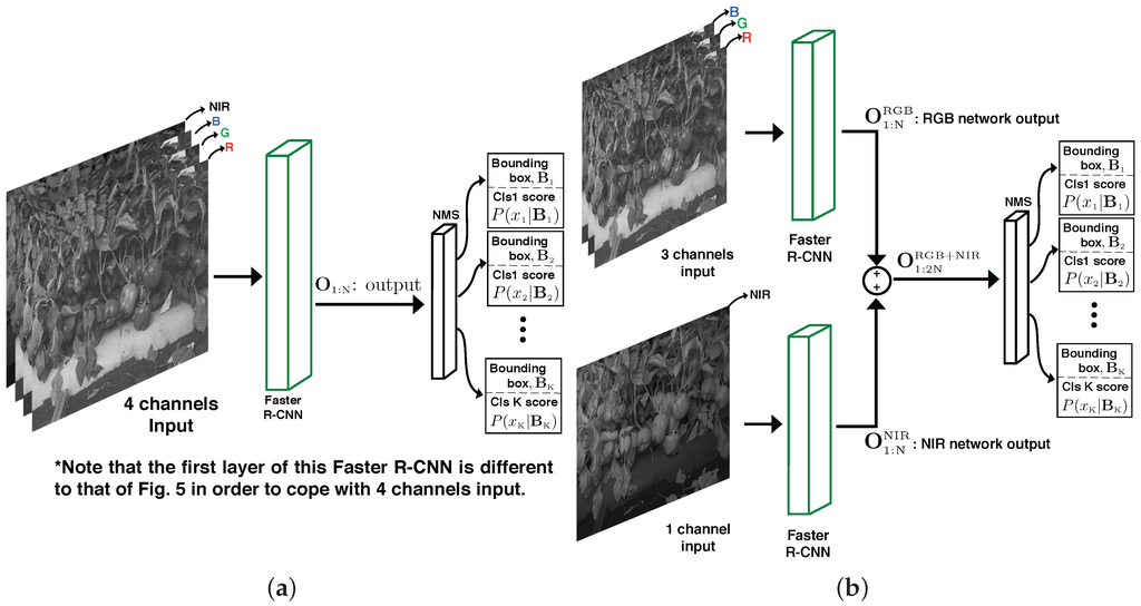 A diagram of the early and late fusion networks. (a) The early fusion that concatenates a 1-channel NIR image with a 3-channel RGB image; (b) The late fusion that stacks outputs, , from two Faster R-CNN networks. and represent the output containing bounding boxes and their scores from the RGB and NIR networks, respectively. K is the number of objects being detected. Note that the Faster R-CNNs of the early fusion are identical to that of Figure 3.