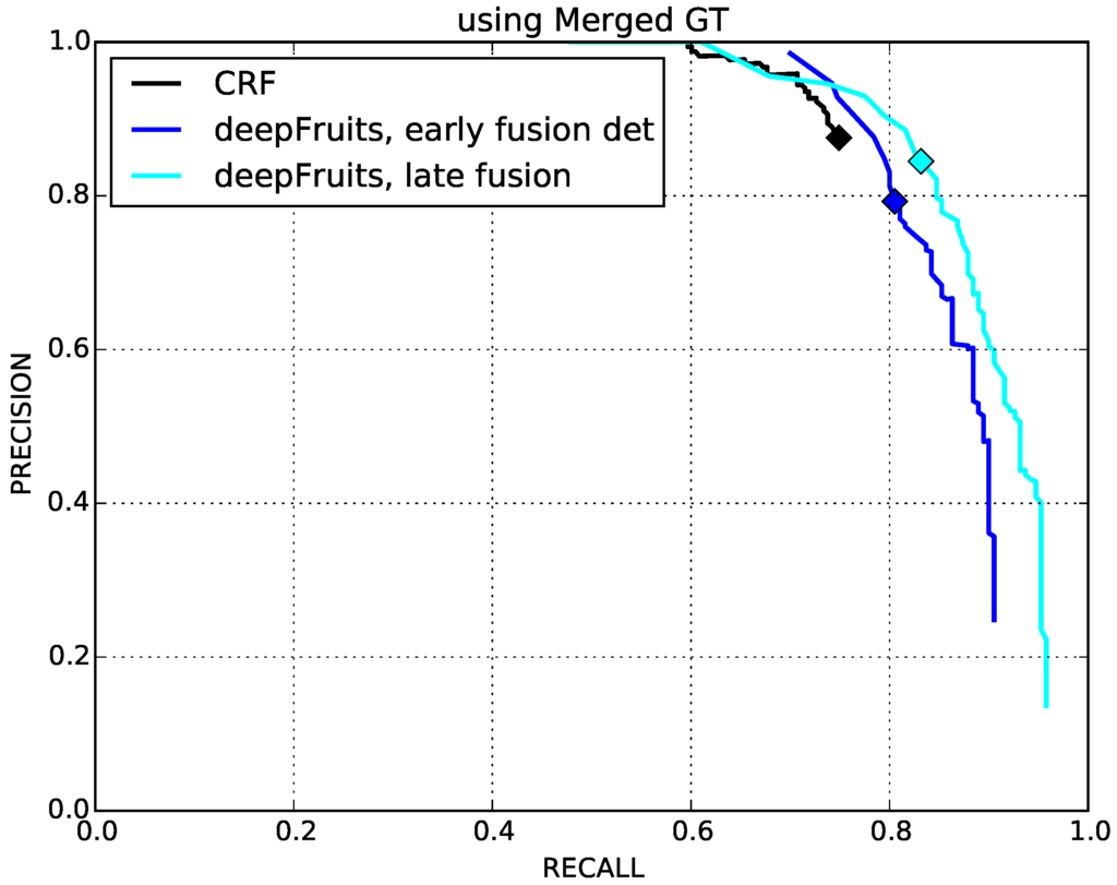 Figure 9 shows the precision-recall curves for the CRF and fused networks. CRF has a similar performance as early fusion, but could not reach late fusion’s performance (shown in Table 3). Note that we can only compute the F1 score of CRF from the valid point where precision and recall are slightly different (see the black markers from Figure 9) due to the denominators of precision and recall from Equation (2) being all zeros. This implies that there are no sweet peppers in the ground truth (); therefore, no false detection () or misdetections () are reported.